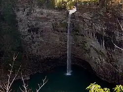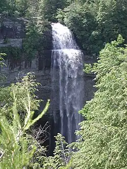 Just beyond its source, Cane Creek slowly gains strength as it absorbs Meadow Creek and several smaller streams. As the creek enters the gorge, it drops several hundred feet in less than a mile, including 45 feet (14 m) over Cane Creek Cascades and 85 feet (26 m) over Cane Creek Falls. A few hundred meters north of Cane Creek Falls, Rockhouse Creek spills 125 feet (38 m) over a plunge waterfall. Over the next half-mile, Cane Creek absorbs Fall Creek and Piney Creek, both of which enter from smaller gorges to the immediate west. During this stretch, part of the creek disappears underground into limestone sinks and reemerges at a spring known as "Crusher Hole."[2] Cane Creek continues to lose elevation before steadying near its confluence with Dry Fork. Beyond Dry Fork, the creek gradually descends to the Highland Rim, where it empties into the Caney Fork River.