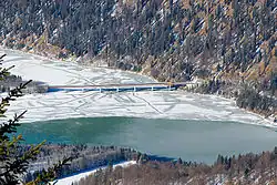 Faller-Klamm-Brücke is a road bridge near Fall in the Lenggries[3] municipality in Landkreis Bad Tölz-Wolfratshausen, Upper Bavaria, Germany. The bridge bears Bundesstraße 307 and spans Lake Sylvenstein (with a water surface of 752.0 MASL) and has one lane per direction.