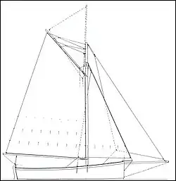 The mainsail is raised on a gaff.[2] The staysail may be rigged to a bumkin which extends its foot past the stem head. The jib is hauled out on a long bowsprit, which is often tightened downwards with the bobstay giving it a slight curve. A topsail is frequently employed, which is raised on a yard rather than a topmast.