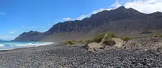 The beach south of the cliffs of Famara, the Playa de Famara, is one of sand and volcanic pebbles. It is two kilometres long. Its orientation towards the Atlantic Ocean makes it suitable for the practice of surfing.[2]