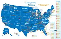 Family Promise's national office works to support existing Affiliates and to develop Affiliates in communities where there is both an identified critical need for services as well as strong community support for providing those services. The national office assesses the degree of need, meets with local leadership and offers guidance on organizing community support.[12] It provides training and support for activities such as recruiting host congregations, securing a day center, forming a board of trustees, hiring staff, developing budgets and raising funds. After an Affiliate is opened, the national office provides ongoing support through technical assistance and training to ensure the Affiliate's programming remains viable over the years.
