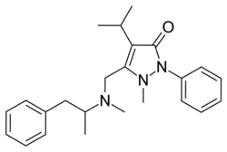 Famprofazone (Gewodin, Gewolen) is a nonsteroidal anti-inflammatory agent (NSAID) of the pyrazolone series which is available over-the-counter in some countries such as Taiwan.[1][2][3] It has analgesic, anti-inflammatory, and antipyretic effects.[1][2] Famprofazone has been known to produce methamphetamine as an active metabolite, with 15–20% of an oral dose being converted to it.[4][5] As a result, famprofazone has occasionally been implicated in causing positives on drug tests for amphetamines.[3]