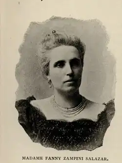 Fanny Zampini Salazar was born in Brussels, 11 May 1853,[3] daughter of Demetro Salazar. She traveled in England, studying the industrial institutions for women in that country, made a report to the government of Italy which was favorably received and an appointment was given her for like service in America. At one time, she published a paper, "The Queen", in the interest of Italian women, for whom she had been a zealous worker, in an effort to raise industrial and intellectual standards. Among her published works are, A Glance at the Future of Woman in Italy, Life and Labors of Demetro Salazar, Guides to Physical and Moral Health of Italian Children, Old Struggles and New Hopes. She was sent as an Italian representative to the World's Congress of Representative Women in Chicago in 1898. She was also elected one of the judges of awards of the World's Columbian Exposition.[4]