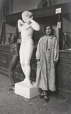 Fano Messan's works are imbued with sensitivity without artifice, with simple and harmonious lines. She also tames wood, stone, ivory or glass to bring her favorite subjects to life. The decorations for the Grand Cercle Casino of Aix-les-Bains and the frieze of "La danse" which used to adorn the wall of the Bal Tabarin, nudes like "l'Androgyne" series presented at the Salon of 1925, animals or figures such as those of Valéry Larbaud or Kees van Dongen who painted her portrait ("Le garçonne, Fano Messan") in exchange for the bust that she made of him in 1929, the year of his French naturalization. This portrait (which remained with Messan's family at least until 2008) shows a fragile and determined Fano, her gaze deep and distant, the slightly ajar bright red mouth defying time. The orange, green and red colors, so frequent in van Dongen work, doesn't prevent Fano's eyes from dominating the composition of the painting while contrasting with the white of the blouse. The photographin portraits of Messan taken by Man Ray (like the one taken in 1928 and acquired by the Centre Pompidou in 1994) share this characteristics of the model.[2][3]