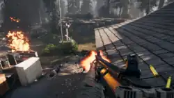 Similar to its predecessors, Far Cry 5 is a first-person shooter set in an open world environment which the player can explore freely on foot or via various vehicles. Unlike previous titles in the series where the player takes on the role of a set character, the game gives the player the opportunity to customize their character's appearance.[1][2] Additionally, the character in this game is a silent protagonist, devoid of voiced dialogue or a predefined personality, offering players the chance to deeply immerse themselves in the game, yet sparking concerns about the potential impact on the depth of narrative engagement.[3][4] While the player has a variety of ranged and explosive weapons to fight against enemies, the game places a renewed emphasis on close-quarters combat compared to previous Far Cry titles by introducing a wider range of melee weapons.[5] In addition, Far Cry 5 features a new weapons ballistics system that includes elements like a bullet dropping over a distance to increase realism.[6]