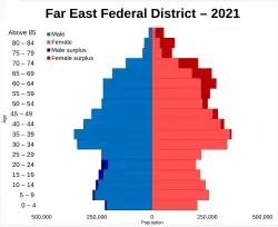 The Far Eastern Federal District (Russian: Дальневосточный федеральный округ, IPA: [dəlʲnʲɪvɐˈstot͡ɕnɨj fʲɪdʲɪˈralʲnɨj ˈokrʊk]) is the largest and the least populated federal district of Russia, with a population of around 7.9 million and an area of 6,952,555 square kilometres (2,684,396 square miles). The federal district is within North Asia as per the UN geoscheme and it is coextensive with the Russian Far East.