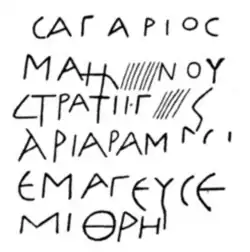 The Greek text reads, "Sagarios the son of Magapharnes, strategos of Ariaramneia, sacrificed to Mithra."[5]