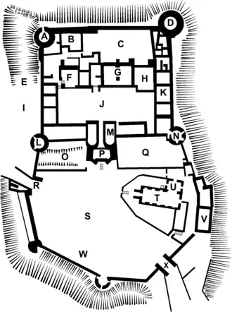 The castle was formed around a court, later called the inner court, enclosed by a curtain wall with a circular tower on each corner and a gatehouse at the front; the north-east tower was larger than the others, perhaps to provide additional defences.[10] Over time the towers acquired their own names: the north-west tower was called the Hazelwell Tower; the north-east the Redcap Tower and the south-west the Lady Tower.[11][nb 2] The ground fell away sharply on most sides of the castle, but its south and west sides were protected with a wet moat, using a dam fed from a nearby spring using a pipe.[13] The gatehouse had twin towers and a drawbridge.[14]