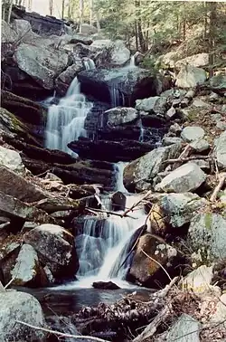 Farley Ledges, 1,067 feet (325 m) is a bluff knob located on the southeast side of Northfield Mountain in eastern Franklin County, Massachusetts. The ledge is notable for its extensive rock climbing ascents; it rises 700 feet (210 m) above the small village of Farley (part of Erving, Massachusetts) and has been used by rock climbers since the 1930s. The Western Massachusetts Climbers Coalition has been active in purchasing land to preserve access to the mountain; 2007 purchases included a parcel along Route 2 developed into a trailhead with a parking lot and access corridor to the ledges. The 110-mile (180 km) Metacomet-Monadnock Trail ascends the wooded north side of the ledges where Briggs Brook Falls tumbles from the ridgecrest; a marked rock climbing access loop trail departs from the Metacomet-Monadnock Trail to traverse both the summit of the ledges and the extensive boulder field beneath.[1][2]