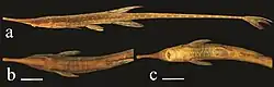 | Holotype specimen a) lateral, b) dorsal, and c) ventral views (scale bar: 1 cm) | |