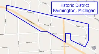 Farmington Historic District is the town center of Farmington, Michigan. It was listed on the National Register of Historic Places in 1976. The area roughly corresponds to the section of Grand River Avenue and Shiawassee Avenue from Warner Street to junction of Grand River and Shiawassee.