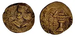 Neither Adur-Sasan nor Tirdat is known to have ruled, which implies that Farn-Sasan was seemingly from a cadet branch of the dynasty.[4] On the obverse of his coins, he is portrayed with a cap. On the reverse, a fire altar is depicted, with an inscription circled around it.[7] Farn-Sasan is the only king known to show a fire altar on coins originating from Sakastan. Around the same time, another king issued coins with a similar fire-altar depicted on it, which was the Sasanian ruler Ardashir I (r. 224–242), who around the same time was extending his domains into the east.[8] It is uncertain if Farn-Sasan copied the iconography of Ardashir I's reverse coins, or vice versa.[6] The resemblance of the coinage of Farn-Sasan and the Sasanian Ardashir I, including the shared name Sasan—a name popular in the Indo-Parthian realm—suggests that the Sasanians and Indo-Parthians possibly shared a common ancestry.[9][1] Modern historians regard them as rivals and claimants to the title of King of Kings.[10] The Iranologist Khodadad Rezakhani argues that Farn-Sasan was a superior of Ardashir I, and that the latter was only able to declare himself Kings of Kings after he defeated Farn-Sasan in 226, which marked the end of Indo-Parthian rule.[11][12]