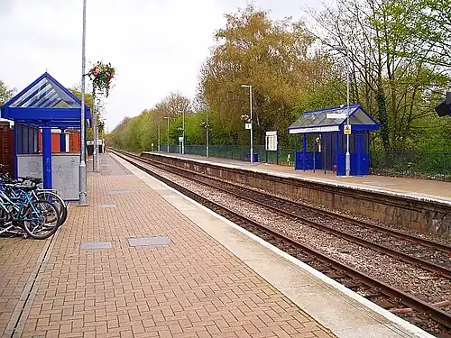 At the station, there is a self-service ticket machine, a very small car park and waiting shelters on each platform. There is a footbridge with lifts providing step-free access to both platforms. There is, however, no staffed ticket office and no waiting room.[1][5]