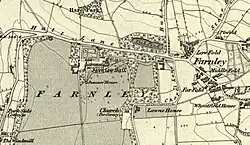 Farnley Parish Church, built in 1885 and dedicated to St Michael, stands across the park from the hall. It replaced an 18th-century building, attributed to John Carr.[4] The classical belfry from this chapel is extant in the churchyard. A chapel is known on this site from 1240. The chapel at Farnley had a historic dedication to St Helen, and a well dedicated to the saint was extant in the village of Farnley until the 1950s when the site was developed for housing by Leeds city council. Remains of medieval tracery used to be preserved in the interior of the church. In October 2011, the church was bought by Saint Makarios The Great Ecclesiastical Trust, who converted it for Romanian Orthodox use.[5]