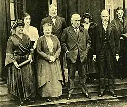Lloyd George at Farnley Hall, 1922. From left to right Mrs Lloyd George, Miss Evelyn Armitage, Mrs Caroline Armitage (the hostess), Sir Berkeley Moynihan, Mr Lloyd George, Mr Robert Armitage (the host)