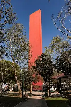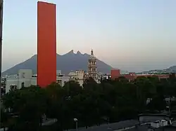 El Faro del Comercio was built in commemoration of the founding of the Chamber of Commerce of Monterrey's on its 100-year anniversary. It is located near the south end of the Macroplaza facing the City's Cathedral and behind the new Monterrey City Hall. El Faro del Comercio is 69.80 meters tall and 12.33 meters wide. Its bright reddish-orange color attracts attention when visiting the Macroplaza, Monterrey's central park.