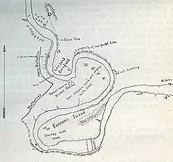 In the colonial era, Farrar's Island was technically a peninsula (a neck of land). However, in 17th century Virginia when the land was acquired by the Farrar family, a neck of land mainly surrounded by a river could also be known as an island.[1] At its most narrow point, the neck was less than 200 yards wide[2] and its elevation above the James River varied from 3 feet to about 49 feet.[3] In the original patent that gave the land to William Farrar, the peninsula was called an island; though in the will of his namesake son, the land was called a neck.[4] By the time of the American Civil War, the peninsula had acquired its common name of Farrar's Island.