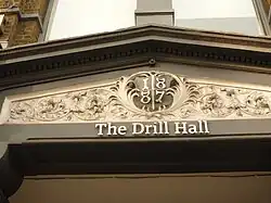 The hall was designed by Alfred J. Hopkins as the headquarters for the 2nd City of London Rifle Volunteer Corps and built between 1887 and 1888.[1] That unit became the 6th (City of London) Battalion The London Regiment (City of London Rifles) in 1908.[2] The battalion was mobilised at the drill hall in August 1914 before being deployed to the Western Front.[3] On the night of 8 September 1915, Zeppelin L13 commanded by Kapitänleutnant Heinrich Mathy attacked London, and two of his bombs hit Messrs Frank Stadelman's warehouse at 59–61 Farringdon Road. Falling masonry from the building did considerable damage to the drill hall behind.[4][5] When the London Regiment was broken up and the battalion moved out to Sutton in its new role as an anti-aircraft unit in the mid 1930s, the hall fell vacant.[6]