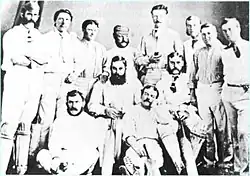 ![]() English cricket team of 1873-74, captained by W.G. Grace. From left standing: G.A. Bush, W. Oscroft, R. Humphries, J. Southerton, M. McIntyre, F.H. Boult, A. Greenwood, W.R. Gilbert. Seated: J. Lillywhite, W.G. Grace, H. Jupp, G.F. Grace. | |