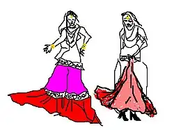 Farshi pajama (Urdu: فرشی پاجامہ, Hindi: फ़र्शी पजामा, Bengali: ফর্শি পায়জামা) is a woman's dress that was worn between early 20th centuries in Muslim courts of Oudh by royalty and ladies from privileged classes of Uttar Pradesh (formerly United Provinces of Agra and Oudh in North India). The Farshi shalwar was also worn in the Punjab region of Pakistan and India. Modeled after the flowing gowns worn by British noblewomen,[1] the complete outfit consists of three basic parts – the kurta or a long shirt, the dupatta or the long stole (an essential piece in traditional Indian wear covering the head and chest), and the third and most important, the farshi pajama, which is a flowing two-legged skirt held by drawstrings. It falls straight to the ankles from where it starts flaring flowing copiously onto the floor. The farshi pajama in this era is often called farshi gharara, a term not used before the mid-20th century.