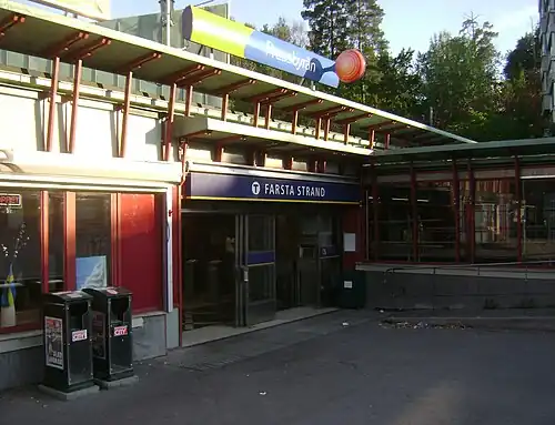 Farsta strand metro station is on the green line of the Stockholm metro, located in Farsta strand, Söderort. It is the end station for line 18. The station was opened on 29 August 1971 as the southern terminus of the extension from Farsta.[2] The distance to Slussen is 10.4 km (6 mi).