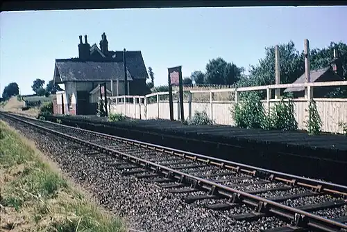 Farthinghoe station was situated on the busiest section of the line, the 5+1⁄2-mile (8.9 km) stretch from Merton Street to Cockley Brake, where there was a junction with the Stratford-upon-Avon and Midland Junction Railway (SMJ).[8] Opened on 1 June 1872, the section provided connections to Towcester and Blisworth.[9] The LNWR and SMJ jointly served Farthinghoe and Merton Street until they were absorbed into the London, Midland and Scottish Railway on 1 January 1923 upon the railway grouping. The station lost its stationmaster from 1930 and came under the control of Banbury, only 3½ miles away.[10] Former SMJ passenger services were withdrawn as from 2 July 1951.[9] Farthinghoe was itself to close to passengers the following year.[11]