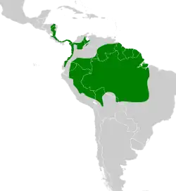 The fasciated antshrike has a disjunct distribution. Subspecies C. l. fasciatus is the northernmost, and its range is separate from the larger area shared by the other two. It is found from El Paraíso Department in southeastern Honduras, south through Nicaragua and Costa Rica on the Caribbean slope, and through Panama on both the Caribbean and Pacific slopes though locally in the latter. Its range continues into Colombia's Magdalena River Valley, east into northwestern Venezuela, and south along the Pacific slope into northwestern Ecuador as far as northern Los Ríos Province. Subspecies C. l. intermedius is found from southern Colombia and Venezuela south through eastern Ecuador and eastern Peru into Bolivia and from that western limit east into northwestern and southern Amazonian Brazil as far as Tocantins and Goiás. The nominate subspecies C. l. lineatus is found from eastern Bolívar state in Venezuela east through Guyana and Suriname into French Guiana and south into Amazonian Brazil north of the Amazon between the Branco and Negro rivers.[3][6][7][8][9][10][11][12][13][14]