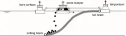 Placement of a mattress in conditions where there is a flowing current is nearly impossible with this method,[24] however placement using a pair of pontoons and a side-stone dumping vessel is possible. In the latter situation, the mattress is connected to a pair of sinking beams (hollow tubes), which are filled with water at the appropriate time to sink the mattress. After immersion, these sinking beams are disconnected from the mattress, filled with air, and recovered.[24]