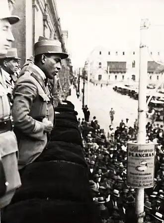 Commander Luis M. Sánchez Cerro, an army officer and militarist who had witnessed the birth of the fascist movement in post-war Europe,[7] led a coup d'état on 22 August 1930, known as the Arequipa Revolution.[8] The rebellion, organized by Sanchez Cerro alongside military officers loyal to him, was highly successful, leading to a consequent uprising of the Lima garrison, who also demanded the resignation of Leguía as president. A group of commanders in Lima, with control of the local troops, expressed their support for their rebellious colleague in Arequipa and took power away from loyalist generals, forcing them to support Sanchez Cerro.[8] The sublevation, with massive social support, ended the aristocratic government of Leguía and put Sánchez Cerro as the new president of Peru, establishing a right-wing junta characterized for its authoritarian and anti-communist posture.[9]