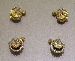 The inner garment of Khitan's man was a short garment or tunic worn under the round-collar gown.[9] They also wore trousers and high-topped boots which were either bordered or rolled at the top.[9] Khitan officials used gold ornamented ribbons to found their hair locks around their foreheads, covering their heads with felt hats according to the Ye Longli's Qidan Guozhi.[11] Khitan wore felt hats, fur clothes and woollen cloth and the Liao emperor switched between Han and Khitan clothing.[5]