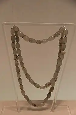 The inner garment of Khitan's man was a short garment or tunic worn under the round-collar gown.[9] They also wore trousers and high-topped boots which were either bordered or rolled at the top.[9] Khitan officials used gold ornamented ribbons to found their hair locks around their foreheads, covering their heads with felt hats according to the Ye Longli's Qidan Guozhi.[11] Khitan wore felt hats, fur clothes and woollen cloth and the Liao emperor switched between Han and Khitan clothing.[5]