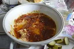 Fasole bătută or fasole făcăluită (literally 'mashed beans') or icre de fasole ('roe of beans') is a bean-based paste prepared in Romania and Moldova. This dip is traditionally made by mashing boiled beans and mixing them with vegetable oil, then adding some chopped onions. Some recipes call for garlic, chili pepper, lime or lemon juice, and additional seasonings.[1]