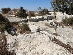 In 1875, Victor Guérin found "numerous cisterns, a great reservoir, vestiges of many ruined houses, fine cut stones marking out floors, and a dozen of winepresses nearly perfect. These winepresses are all on the same model. Worked in the rock, they consisted of two compartments, one larger, in which the grapes were placed, and one smaller and lower down, in which the juice was received." In the church Guerin saw a Corinthian pillar, probably Byzantine, carved with a cross. Above the door was a frieze finely decorated with flowers and foliage.[35]
