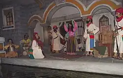 Naturally he chose a Harem style as the base theme for the music. More specifically, the beginning of the ride is linked by orchestral music to the dreamy, mideastern music with flutes and violins of the market, the first setting of the attraction. The music gets darker when the ride passes the prison part. A slow melody sets in upon entering the harbor but is extended with instruments like violins, gongs and a percussion. The musical climax comes when the ride ends in the final scene of the throneroom.