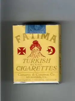 In the early 1900s, manufacturers of Turkish and Egyptian cigarettes tripled their sales and became legitimate competitors to leading brands. Fatima cigarettes was one of many cigarettes developed at this time which received wide success. Liggett & Myers Fatima cigarettes, named after a common first name for Arabic women, was one of them. The pack art featured a veiled woman, the Turkish crescent moon with stars, and the Iron Cross, the symbol of the Ottoman empire.[4] It was the best-selling cigarette brand in the U.S. from 1910 to 1920.[5]