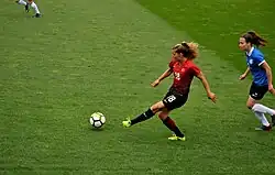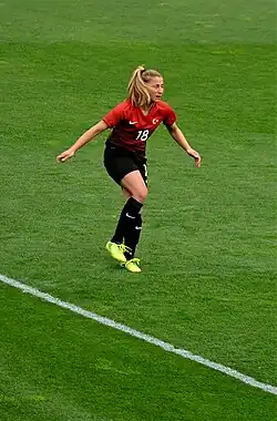 She was admitted to the Turkey women's national football team,[5][6] and debuted internationally in the 2019 FIFA Women's World Cup qualification – UEFA preliminary round – Group 4 match against Montenegro.[7]