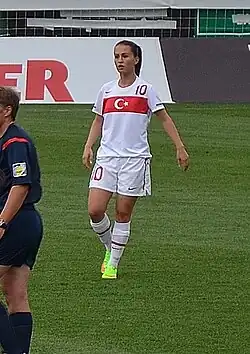 In 2007 still living in Germany, she was called up for the Turkey girls' U-17 national team, and made her debut in the friendly match against the Azeri team on May 27.[13] Until October 2007, she capped ten times in the youth national team, and participated also at the 2008 UEFA Women's U-17 Championship qualification round matches.[1]