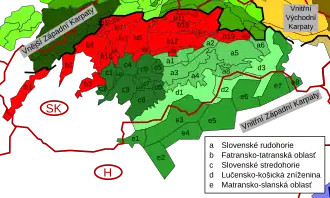 | Subdivisions | Branisko, Choč Mountains, Greater Fatra, Horehronské podolie, Hornád Basin, Kozie chrbty, Lesser Fatra, Little Carpathians, Low Tatras, Považský Inovec, Staré Hory Mountains, Strážov Mountains, Sub-Tatra Basin, Súľov Mountains, Tatras, Tríbeč, Turiec Basin, Upper Nitra Basin, Žilina Basin and Žiar |