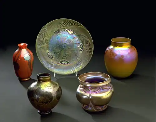 Favrile glass is a term originally used as a trade name for art glass produced at Tiffany Furnaces, a glassmaking factory owned by Louis Comfort Tiffany.[1][2] In modern times, the term is often used to describe the type of iridescent glass Tiffany produced there.[1] While first produced in the United States by Tiffany, this glass, a kind of lustred glass, was actually invented by Arthur J. Nash, inspired by the iridescence of corroded glassware unearthed from Roman ruins.[2] Tiffany lustred glass has a "soft, satiny sheen" due to Tiffany's use of opaque glass, in contrast to the "mirrorlike finish" achieved by some European varieties of lustred glass, which used transparent glass.[2]