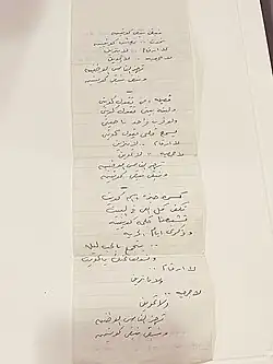 In 2000, the Kuwaiti authorities found an ambiguous letter in the handwriting of the poet Fayeq Abdul-Jaleel, which was received by a Mauritanian novelist, who was invited to a cultural conference in Iraq. An unknown person (believed to be one of the security elements attached to the Special Security Agency of Qusay Saddam Hussein) came to her carrying that message to her for the purpose of delivering it to the Kuwaiti diplomatic mission in the Mauritanian capital (Nouakchott). The details of that story were mentioned in a television interview with the official concerned with the issue of Kuwaiti prisoners at the Ministry of Interior at that time.[11]