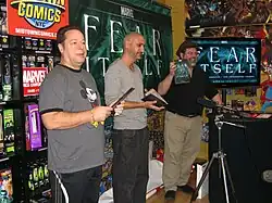 To promote Fear Itself: Fearsome Four #1, one of the tie-in books, writer Brandon Montclare and artists Michael Kaluta and Ryan Bodenheim appeared at Midtown Comics Downtown on June 8, 2011, where they signed copies of the book.[21][22] Writers Greg Pak, Fred Van Lente and editor Mark Paniccia later held a signing at the same store on June 18 for Alpha Flight #1, which is also part of the storyline.[23]