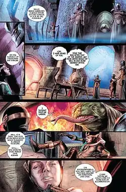 At Comics Bulletin, a roundtable review of issue #1 by five reviews resulted in an average rating of 3.7 out of 5 bullets. The reviewers generally praised the writing and art, though Ray Tate, who expressed an aversion to large-scale "event" storylines, questioned the first issue's execution, and perceived out-of-character behavior on the part of Odin. Norse mythology fan Thom Young stated that certain elements did not resonate or ring true to him.[142] Danny Djeljosevic gave issue #2 a rating of 3.5 bullets, again praising the tension-building of the story and the art.[143] For issue #3, Shawn Hill rated it 3.5, stating that art and characterization justified continued patronage of the series, but that the plot did not, while Sam Salama Cohén exhibited an overall more positive reaction, with 4.5 bullets.[144] Djeljosevic gave 4 bullets to issue #4, complimenting Fraction for hitting his stride as he scripted "the most technically daunting task in his comics career", and singling out the parallel scenes of Odin and the Serpent rallying their troops in particular. Like Doug Zawisza, Djeljosevic was impressed by Stuart Immonen's ability to effectively render different subjects, from sleepy seaside Canadian towns to superhero battles, and remarking, "Immonen is easily the most versatile artist in comics, who will surely go down as one of the greats with his striking layouts and dynamic, varied panel to panel storytelling. Immonen reminds me of the old-school Marvel Comics artists, who were capable of delivering strong, consistent work every month with little need for fill-ins."[145]