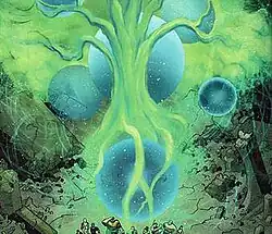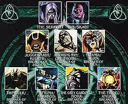 The storyline's title is a reference to a famous quote by Franklin D. Roosevelt: "So, first of all, let me assert my firm belief that the only thing we have to fear is fear itself—nameless, unreasoning, unjustified terror which paralyzes needed efforts to convert retreat into advance", as indicated by the use of a portion that quote as part of the soundtrack of the trailer presented during the Midtown press conference.[11] The story's antagonist is the Serpent, an Asgardian being who sows doubt and fear among the superheroes of the Marvel Comics Universe,[12] as illustrated by early promotional images for the event, which depict Spider-Man, Hulk, Captain America, Cyclops, Thor, and Iron Man coming face to face with their worst nightmares.[1][13] During this conflict, which is referred to among the characters as the Serpent's War,[14] the Serpent is revealed to be Cul, Odin's brother, who assumed the throne of Asgard following the death of their father. Born at the dawn of time, Cul was subsequently banished and imprisoned by Odin following Cul's corrupt rule, and a prophecy by Yggdrasil that cost Odin his right eye, and which revealed that Cul's madness could only be cured by the death of Odin's son.[15][16]