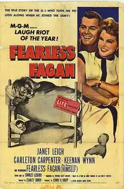 Fearless Fagan is a 1952 American comedy film directed by Stanley Donen and stars Janet Leigh and Carleton Carpenter. It is about a clown who is drafted into the military and tries to sneak his pet lion into the service.[2] The film was inspired by the 12 Feb 1951 Life Magazine story Fearless Fagan Finds a Home where Private Floyd D. Humeston requested an emergency 14-day furlough from Ft. Ord, California to take care of his pet lion.[3] Fagan played himself with the army assigning Pvt Humeston to act as a technical adviser on the film.[4]