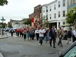 Just like other Italian feasts in the area (like Saint Anthony's Feast and the Fisherman's Feast), large life-sized statues of the saints are carried by members of the Saints Cosmas and Damian Society down local streets. As the Procession moves along, the Saints are stopped at each house, where people put money and gold on the statues. By the end of the festival, the statues of the saints are filled with money and gold.