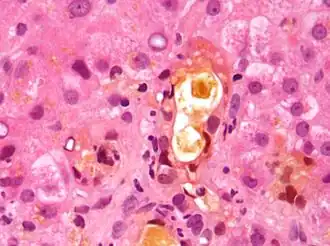 In histopathology, feathery degeneration, formally feathery degeneration of hepatocytes, is a form of liver parenchymal cell (i.e. hepatocyte) death associated with cholestasis.[1]