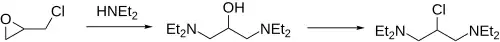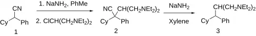 Sodamide is used to alkylate cyclohexylphenylacetonitrile [3893-23-0] (1) (also used for drofenine) with 2-chloro-N,N,N',N'-tetraethylpropane-1,3-diamine [3492-54-4] (HCl: [94465-65-3]) to give (2). Some rearrangement is possible to give a mixture of regioisomers. Sodamide catalyzed cleavage of the nitrile group in a separate step then completes the synthesis of feclemine (3).