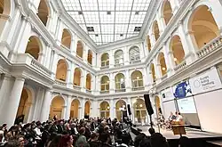 In addition to the historical work, there are three sub-programmes: "European and International Politics", "Global Markets and Social Justice" and "Democracy and Society".[6] They take up thematic impulses in Helmut Schmidt's life and address current political issues. A particular focus is on the future of transatlantic relations: In this regard, the foundation has already staged several symposiums[7] and, in cooperation with the German Marshall Fund, established a high-ranking commission of experts charged with making recommendations by the autumn of 2020.[8] This "Transatlantic Task Force"[9] includes European and US experts such as Catherine Ashton, Cecilia Malmström, Will Hurd, Elissa Slotkin, Henrik Enderlein, or Michael Froman. It is chaired by President of the German Marshall Fund Karen Donfried and German diplomat Wolfgang Ischinger.