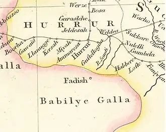 In the early 1800s emir ʽAbd ar-Rahman ibn Muhammad was taken to Fedis as prisoner by the Oromo following his unsuccessful attempt to extract tax from them, this led to his brother emir ʽAbd al-Karim ibn Muhammad seizing the throne in 1825.[7] In 1827 Fedis became a battleground between Oromo factions who supported the aforementioned princes of Harar which devastated three settlements in the region.[8] By the late 1800s, Fedis Oromo state Islam had been firmly established among them following emir Abd ash-Shakur dispatching a Harari Muslim scholar to teach religion and construct a mosque.[9]