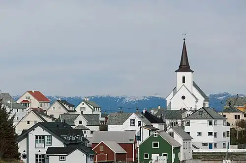 Fedje Church (Norwegian: Fedje kyrkje) is a parish church of the Church of Norway in Fedje Municipality in Vestland county, Norway. It is located in the village of Fedje on the northern coast of the island of Fedje. It is the church for the Fedje parish which is part of the Nordhordland prosti (deanery) in the Diocese of Bjørgvin. The white plastered brick church was built in a long church design in 1941 using plans drawn up by the architect Ole Halvorsen. The church seats about 400 people. The church is built of brick and covered with white plaster. This was chosen because it is better suited than wood for the harsh marine climate on Fedje. The roof consists of slate from Alta Municipality and the tower is covered with copper.[1]